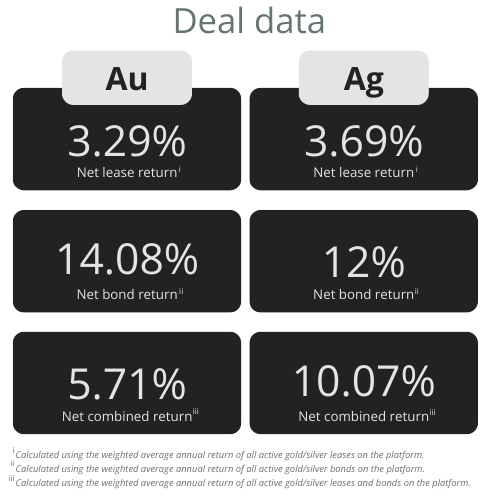 2Individual returns will vary, depending on opt-out selections. This number represents the annualized net return in gold to clients invested in all available leases and bonds on the platform. Due to the nature of bonds, part of this return calculation is unrealized. There are risks to leasing and loaning your precious metals, and all returns are subject to lessee, sublessee, and borrower performance. Past performance is no guarantee of future results.