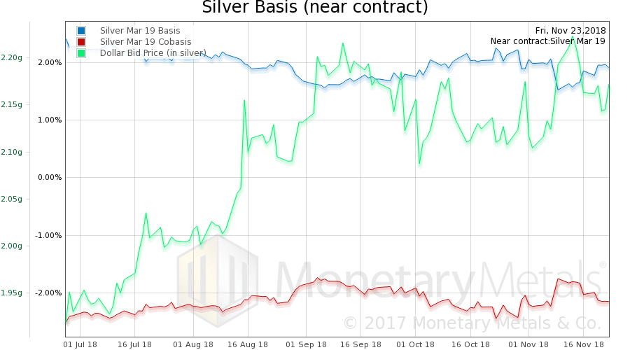 Here is the gold graph showing gold basis, cobasis and the price of the dollar in terms of gold price.