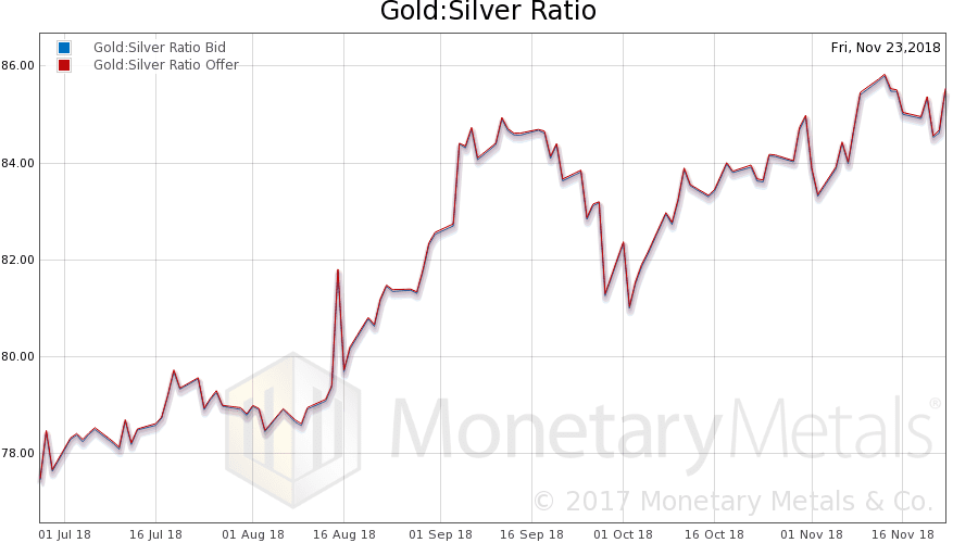 Next, this is a graph of the gold price measured in silver, otherwise known as the gold to silver ratio (see here for an explanation of bid and offer prices for the ratio). It rose a point this week.