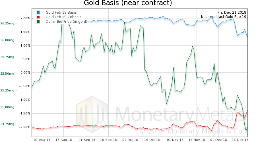 Here is the gold graph showing gold basis, cobasis and the price of the dollar in terms of gold price.