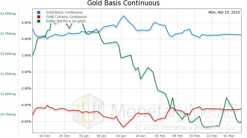 Genius, in this sense, is looking at spreads and changes in spreads. Few pay attention to spreads, but we have long been talking about a spread called the gold basis. To oversimplify, this is the price of a gold futures contract minus the spot price of gold. This spread tells us whether it is profitable to carry gold. Carrying is buying spot and simultaneously selling a futures contract. Market makers do this when the spread is not only positive, but enough to make the trade worthwhile.