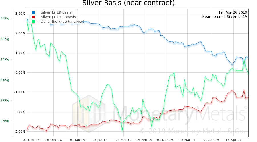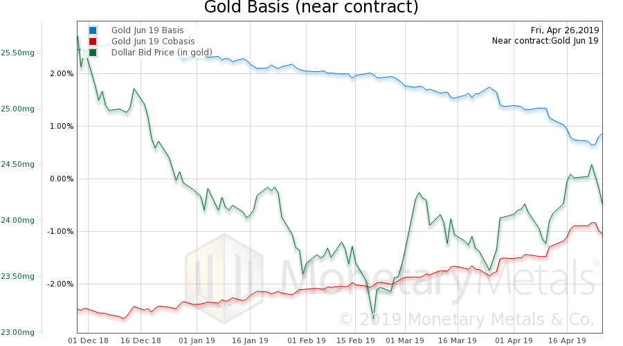 Here is the gold graph showing gold basis, cobasis and the price of the dollar in terms of gold price.
