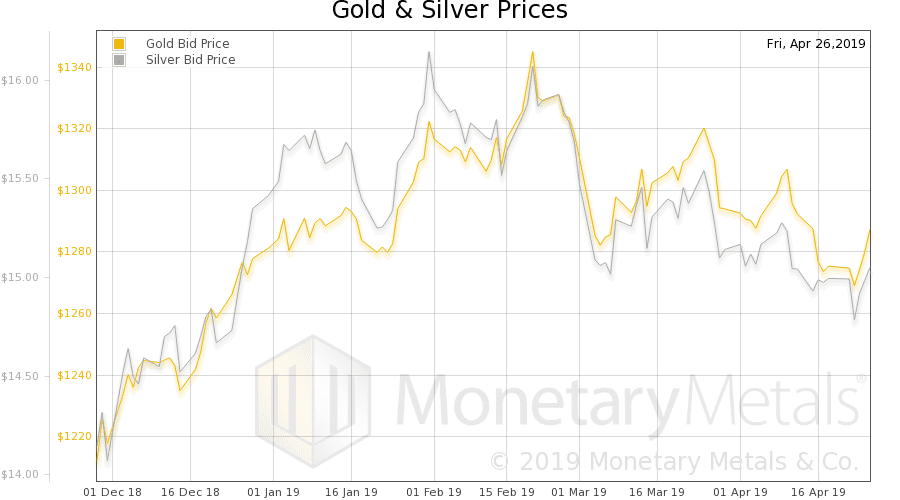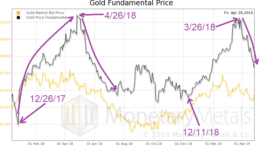 The Monetary Metals Gold Fundamental Price is down a whopping $53, to $1,373.