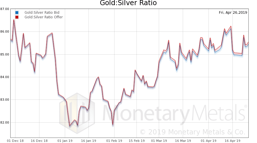 Next, this is a graph of the gold price measured in silver, otherwise known as the gold to silver ratio (see here for an explanation of bid and offer prices for the ratio). The ratio rose.