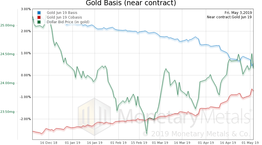 Here is the gold graph showing gold basis, cobasis and the price of the dollar in terms of gold price.