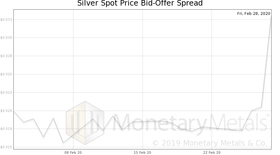 On 17 Feb, we wrote about the widening bid-ask spread in the spot markets for gold and silver. The spread in silver was around 2 cents (up from where it had been humming along at ½ cent until about a year ago), then just over 1 cent. By mid-February, it was over 1.5 cents.