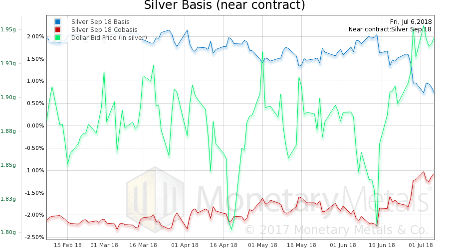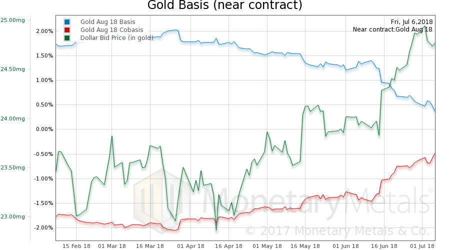 Here is the gold graph showing gold basis, cobasis and the price of the dollar in terms of gold price.
