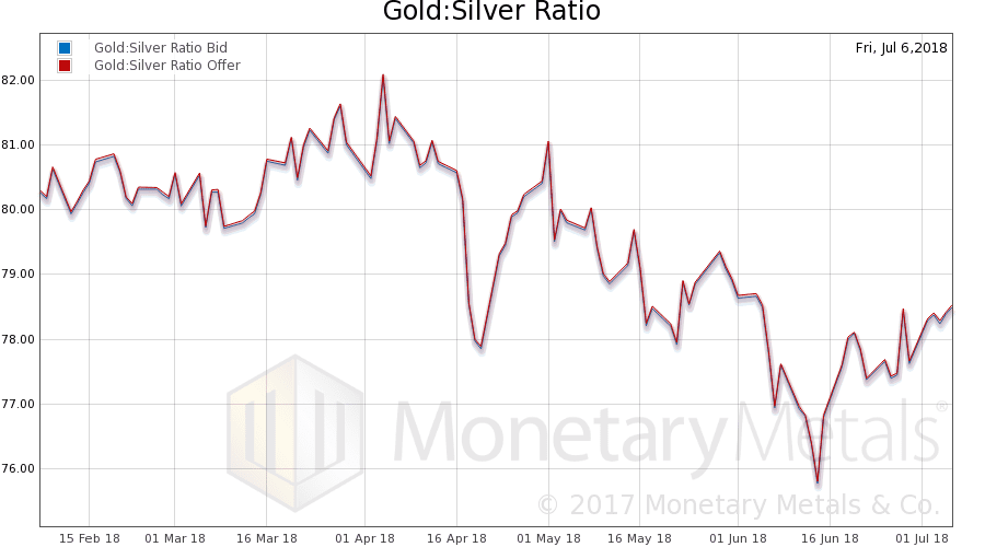 Next, this is a graph of the gold price measured in silver, otherwise known as the gold to silver ratio (see here for an explanation of bid and offer prices for the ratio). It went up this week.