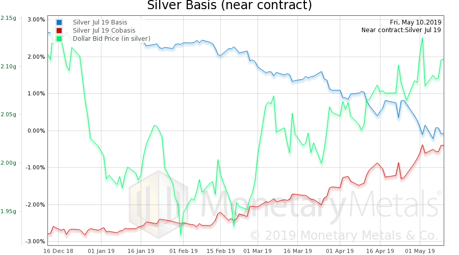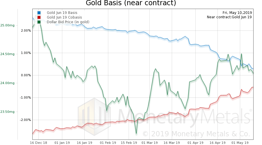 The scarcity (i.e. cobasis) rose a bit, but this is the soon-to-expire June contract. The gold basis continuous, not so much.