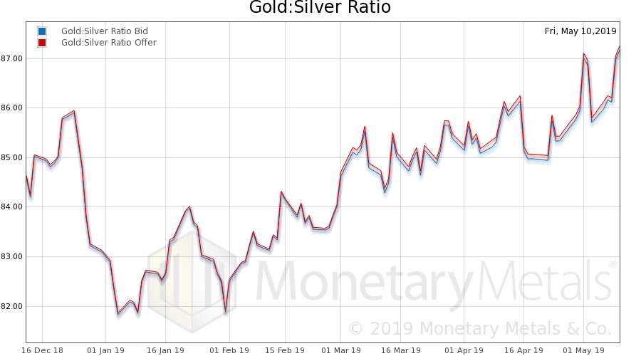 Next, this is a graph of the gold price measured in silver, otherwise known as the gold to silver ratio (see here for an explanation of bid and offer prices for the ratio). The ratio rose, to a new high over 87.