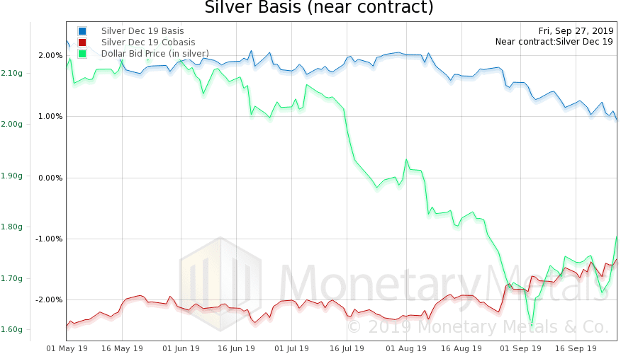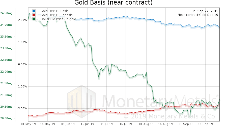 The scarcity (i.e. cobasis) rose a little bit this week. At least the near contract (but not the gold basis continuous). There is no profit to decarry gold. The profit is to carry it—that is buy gold and simultaneously sell it forward, warehousing it for the duration. For December, which is just 3 months, one can make about 1.7% annualized.