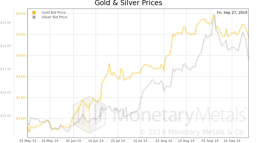 This week, the Monetary Metals Gold Fundamental Price fell $33, to $1,459