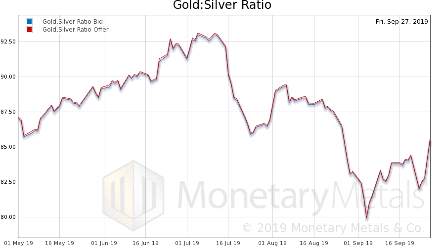 Next, this is a graph of the gold price measured in silver, otherwise known as the gold to silver ratio (see here for an explanation of bid and offer prices for the ratio). The ratio rose this week.