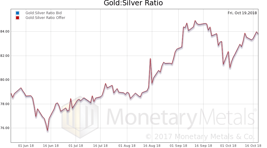 Next, this is a graph of the gold price measured in silver, otherwise known as the gold to silver ratio (see here for an explanation of bid and offer prices for the ratio). It rose slightly this week.