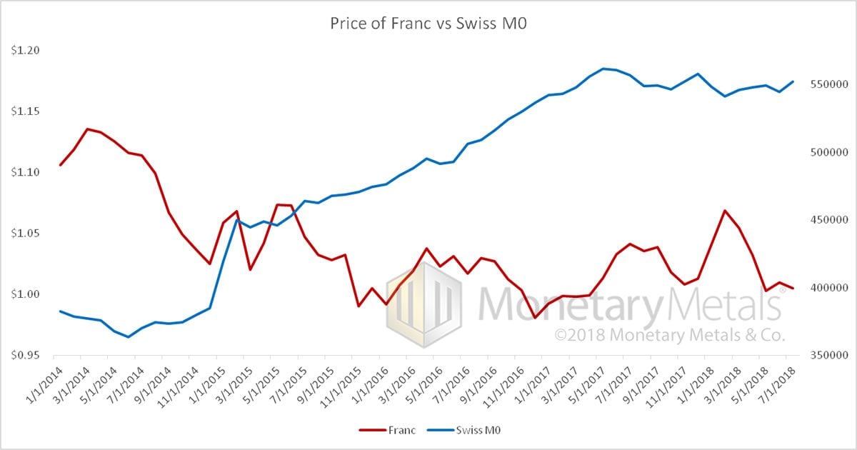 But we are interested in matters monetary. We want to see how the franc fared against the dollar, from which it ultimately derives (the US M0 admittedly rose faster during this period—44%). Here’s a graph of the price of the franc against Swiss M0.