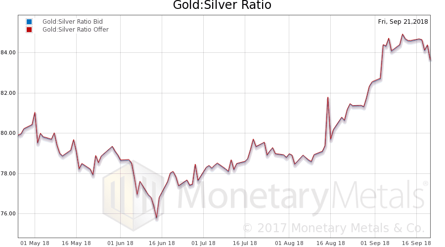 Next, this is a graph of the gold price measured in silver, otherwise known as the gold to silver ratio (see here for an explanation of bid and offer prices for the ratio). It turned and fell this week.